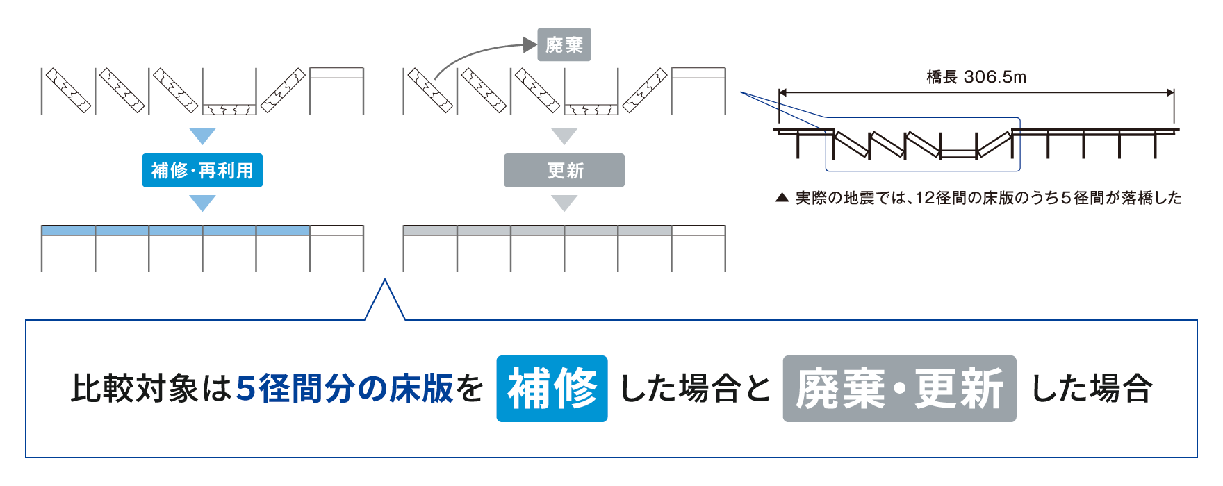 - 落橋した床版の回収、および再架設にかかる工程はおおよそ同等として比較対象からは除外